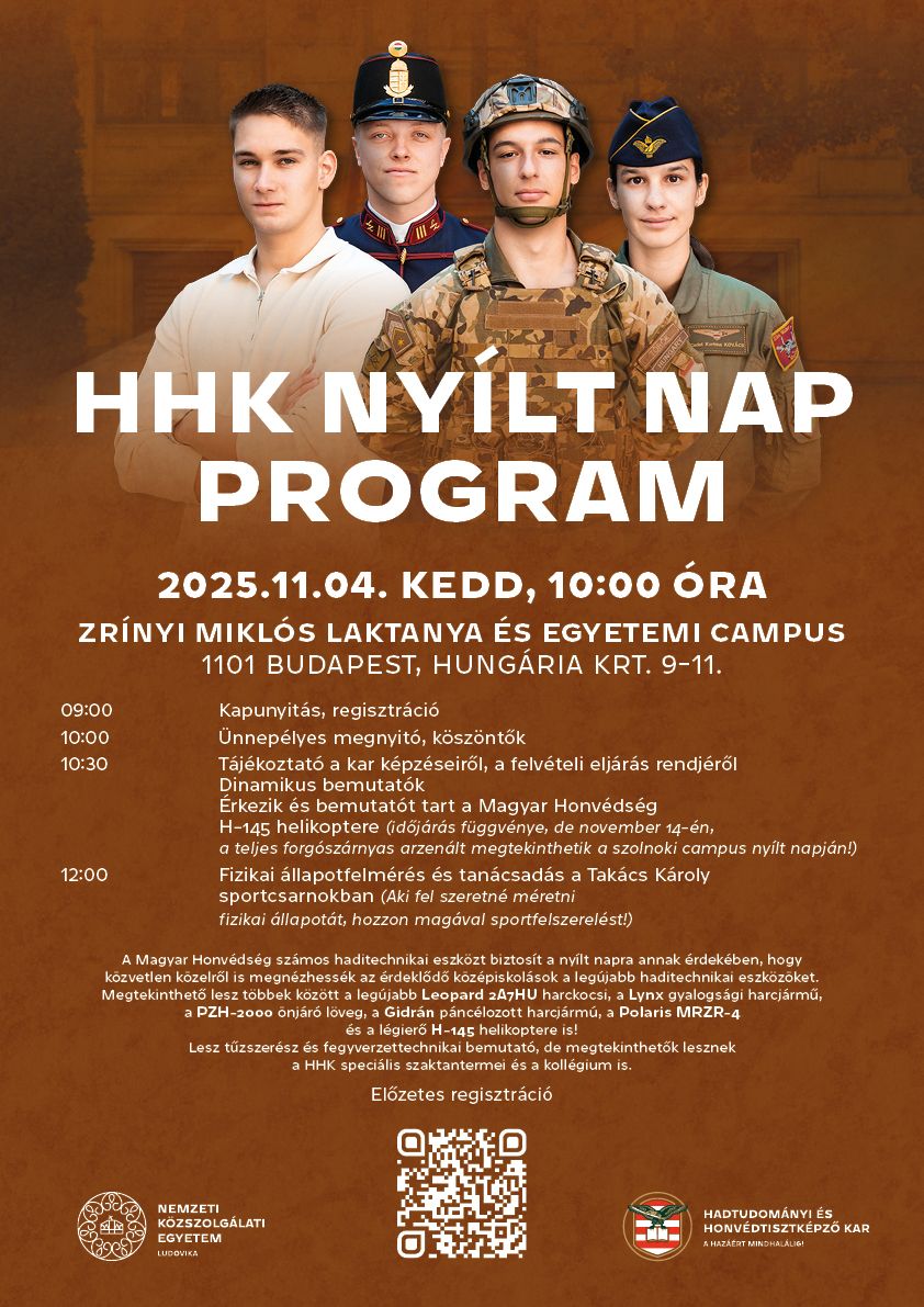 November 4-én (kedd) 10 órától nyílt napot tartunk a Zrínyi Miklós Laktanya és Egyetemi Campuson, amelyre várjuk a HHK képzései iránt érdeklődő középiskolásokat.
